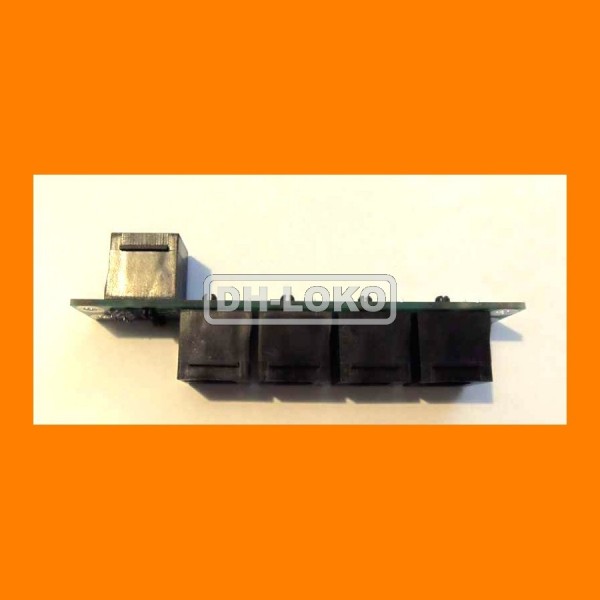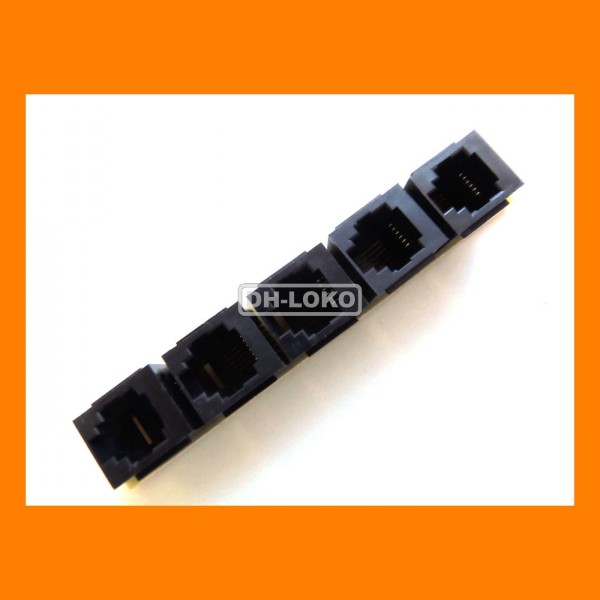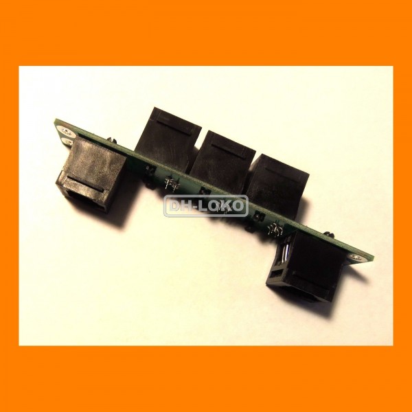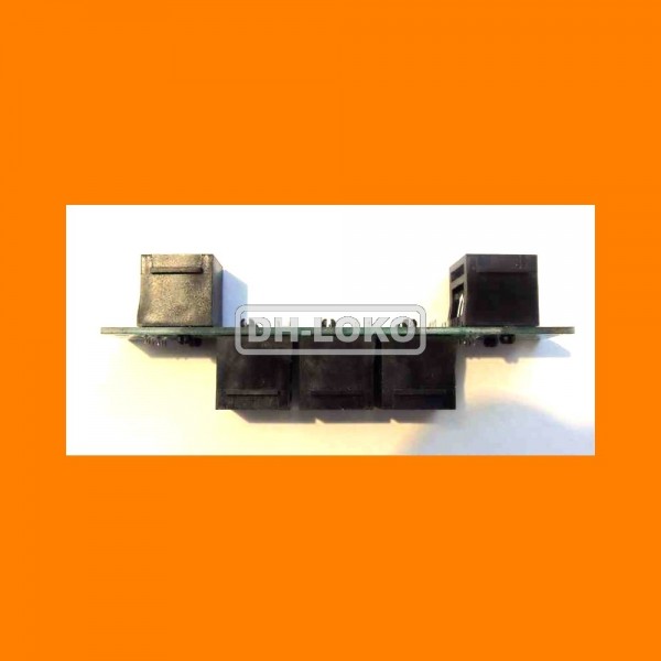 Pět pozic RJ12 6P6C z tři uprostřed z jedné strany, krajní z druhé. Testováno na DR5000 a ROCO MAUSE ovladači testované pro DCC X-BUS... OK