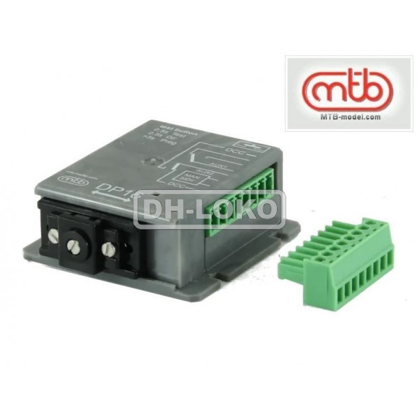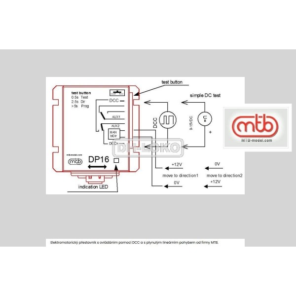 Přestavník DP16 je vybaven rozhraním DCC které zajišťuje příjem digitálních povelů a současně napájení chodu přestavníku. Dále obsahuje pomocný přepínací kontakt AUX1 pro indikaci a napájení srdcovky. Pro zjednodušené napájení srdcovky lze využít i signal AUX2, který je spojen s DCC vstupy.