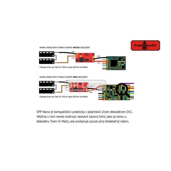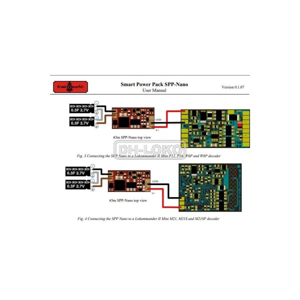 SPP Nano se připojuje prakticky ke všem DCC dekodérům. Pomocí dvou vodičů připojených k plusovému a mínusovému pólu dekodéru. Není potřeba žádný datový kabel a nelze regulovat dobu počátečního nabíjení. To není nutné, protože superkondenzátory se nabíjejí pomaleji než u SPP a SPP-N (asi 10 sekund).